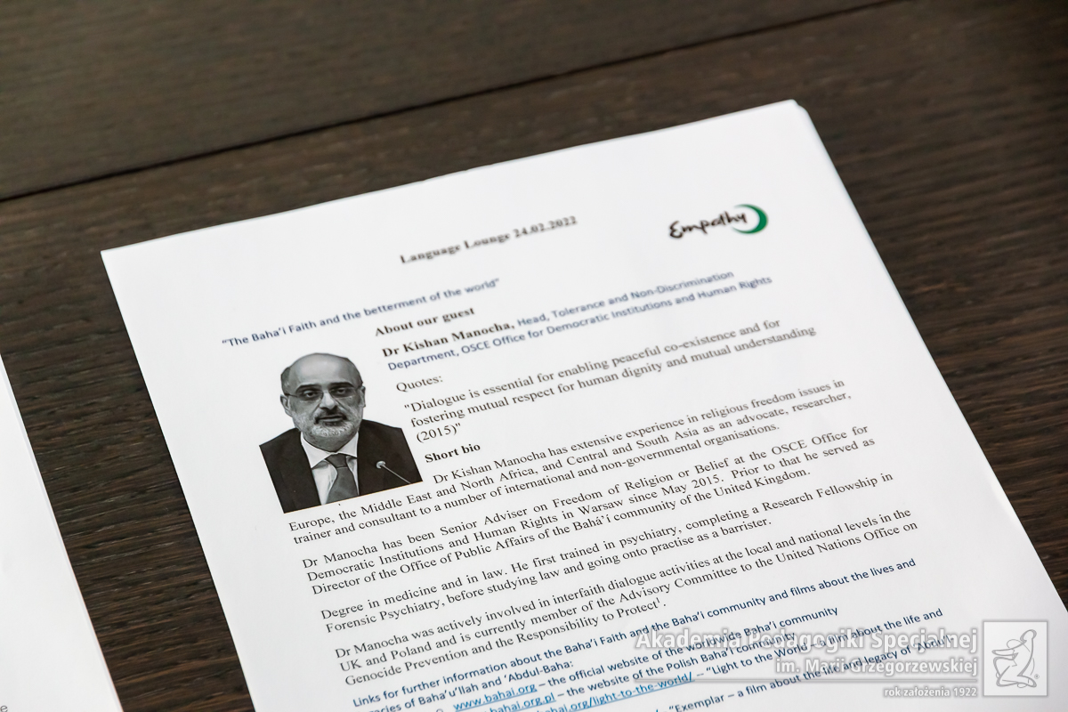 Wydarzenie uświetniło wystąpienie Dr Kishana Manochy, który dokonał uroczystego otwarcia serii szkoleniowej i wygłosił wykład inauguracyjny. Dr Kishan Manocha pełni funkcję szefa Departamentu na rzecz tolerancji i niedyskryminacji w Biurze ONZ - Office for Democratic Institutions and Human Rights.