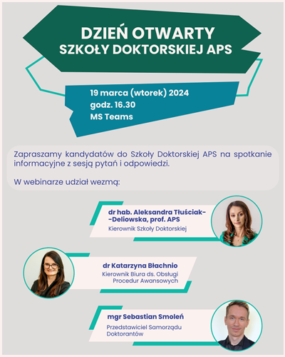 Rozpoczynamy przygotowania do procesu rekrutacji do Szkoły Doktorskiej APS na rok akademicki 2024/2025. Zapraszamy do udziału w Dniu Otwartym!