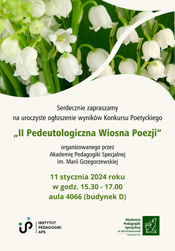 Serdecznie zapraszamy na uroczyste ogłoszenie wyników Konkursu Poetyckiego „II Pedeutologiczna Wiosna Poezji", które odbędzie się 11 stycznia o godz. 15:30 w auli 4066 (budynek D).
