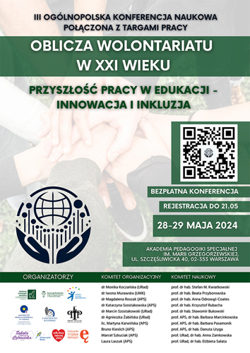 Zapraszamy do udziału w III Ogólnopolskiej konferencji naukowej Oblicza wolontariatu w XXI wieku. Przyszłość pracy w edukacji - innowacja i inkluzja, która odbędzie się 28-29 maja w Akademii.