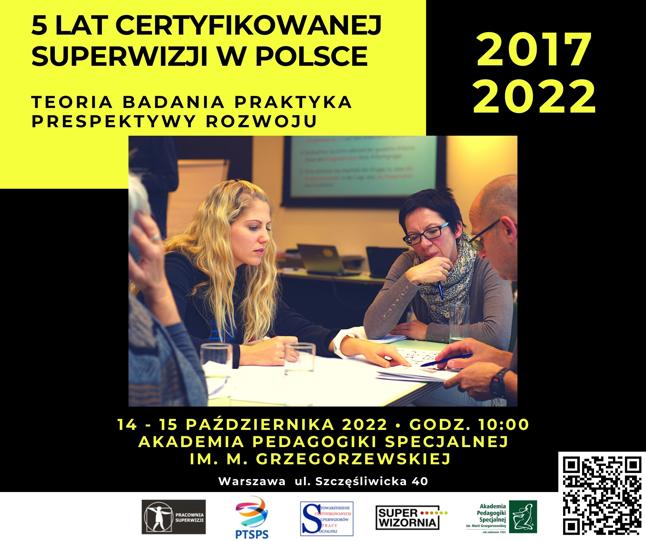 Szanowni Państwo, zapraszamy do udziału w konferencji pod tytułem: „5 lat certyfikowanej superwizji pracy socjalnej w Polsce. Teoria - badania - praktyka. Perspektywy rozwoju”, która odbędzie się w dniach 14-15 października 2022 roku w Akademii Pedagogiki Specjalnej im. Marii Grzegorzewskiej, przy ul. Szczęśliwickiej 40.