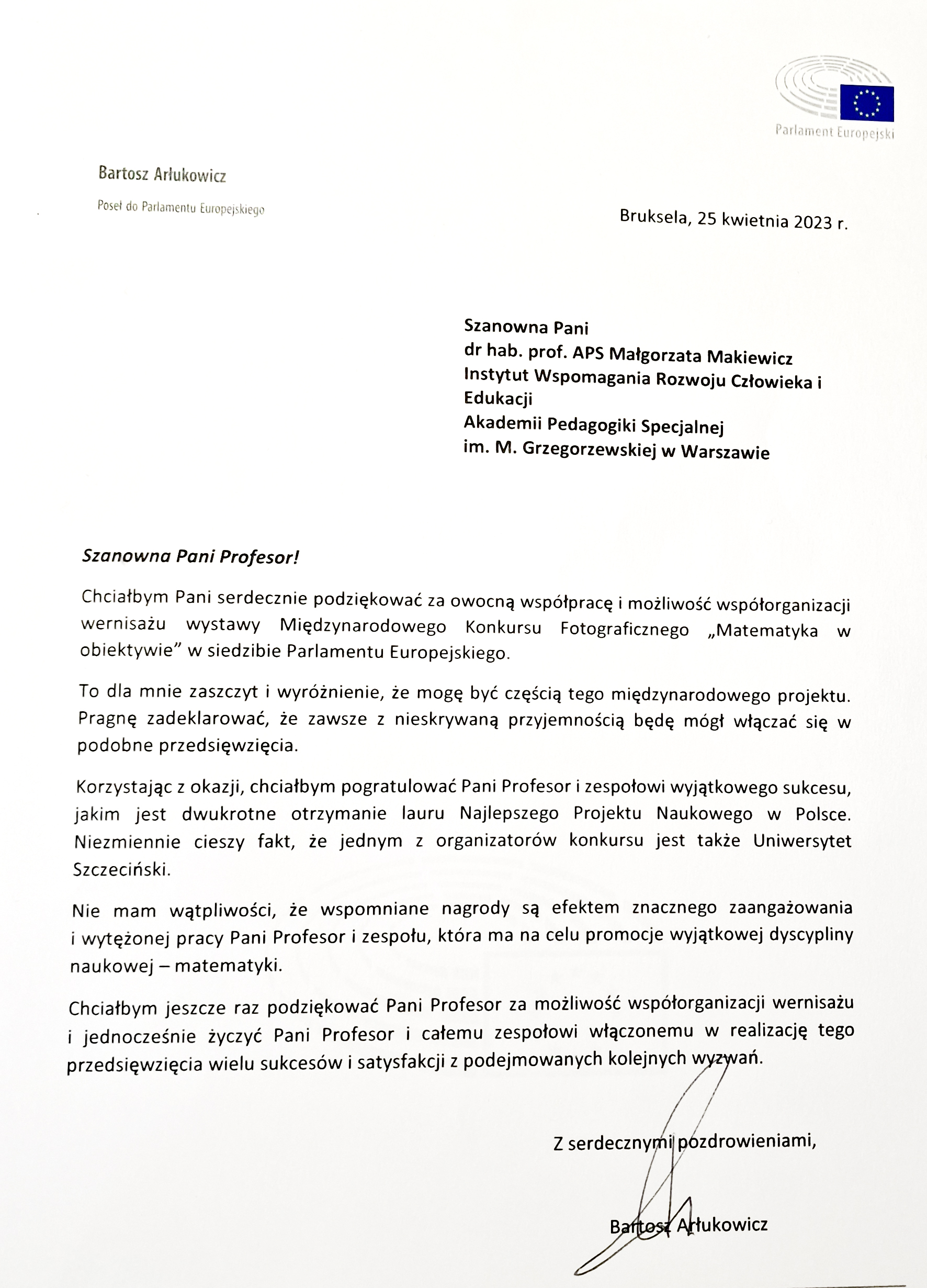 Dziękujemy za zaproszenie i wyróżnienie Europosłowi PE Bartoszowi Arłukowiczowi.