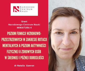 • dr Natalia  Gawron - "Poziom funkcji wzrokowo-przestrzennych w zakresie rotacji mentalnych a poziom aktywności fizycznej u zdrowych osób w średniej i późnej dorosłości" (MINIATURA 4)