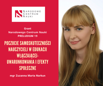 • mgr Zuzanna Marta Narkun - "Poczucie samostateczności nauczycieli w edukacji włączającej - uwarunkowania i efekty społeczne" (PRELUDIUM 19)