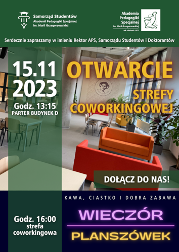 Serdecznie zapraszamy społeczność Akademicką na otwarcie strefy coworkingowej w środę 15 listopada o godz. 13:15 oraz na otwarcie odnowionego Biura Samorządu Studentów o godz. 13:40 w pokoju 1054.