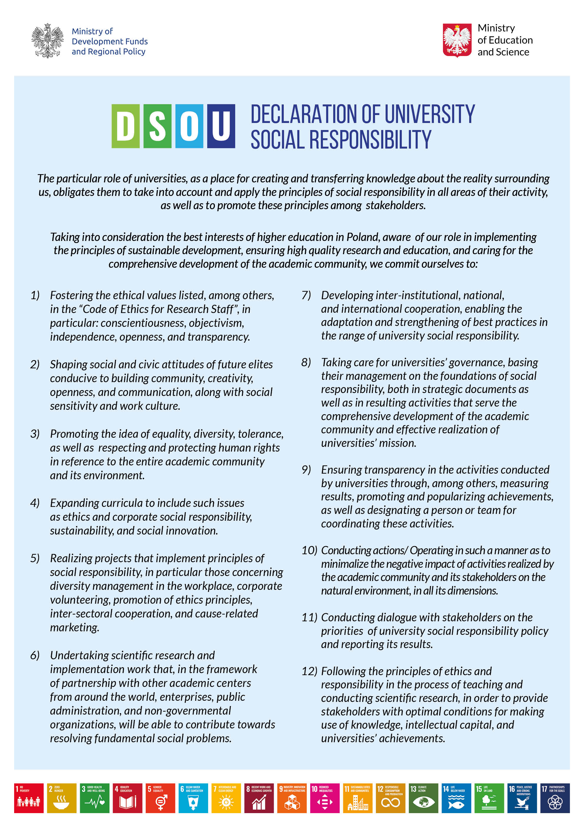 W nowych programach studiów oraz sylabusach odzwierciedlony został kierunek naszej działalności w tym zakresie. W uczelni realizowane są granty z Funduszy Unijnych i Funduszy Norweskich wpisujące się w cele Deklaracji.