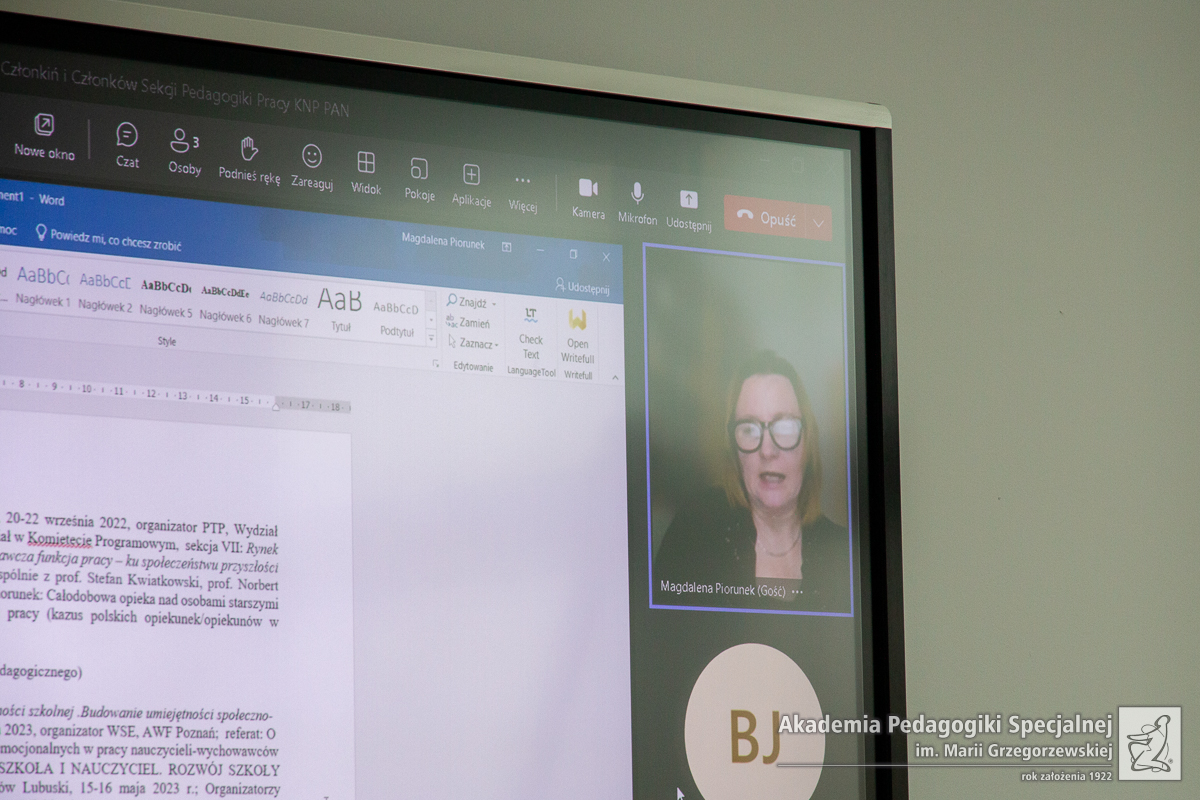 Druga część spotkania zorientowana była na identyfikację obszarów niezagospodarowanych badawczo i głównych nurtów poszukiwań naukowych. Wśród wiodących tematów wskazano między innymi (1) wzmocnienie procesu tworzenia i aplikacji Branżowych Centrów Umiejętności (BCU), w tym (2) aktywne wspieranie funkcjonowania systemu kształcenia i nadawania kwalifikacji nauczycielom kształcenia zawodowego, (3) rozszerzenia działań z zakresu poradnictwa i doradztwa zawodowego dla grup defaworyzowanych i zagrożonych marginalizacją społeczną (osób z niepełnosprawnościami, w kryzysach społecznych) oraz (4) objęcie szeroko rozumianym monitoringiem zjawisk o charakterze pedagogiczno-edukacyjnym towarzyszących tranzycji na rynek pracy najmłodszego pokolenia, a także funkcjonowania w nim najstarszego aktywnego zawodowo pokolenia. Końcowym punktem spotkania było zaakcentowanie przez Panią dr hab. Renatę Tomaszewską, prof. UKW coraz silniejszej obecności sztucznej (maszynowej) inteligencji w procesie pracy i wynikających z tego wyzwań dla świata pedagogów i edukatorów.