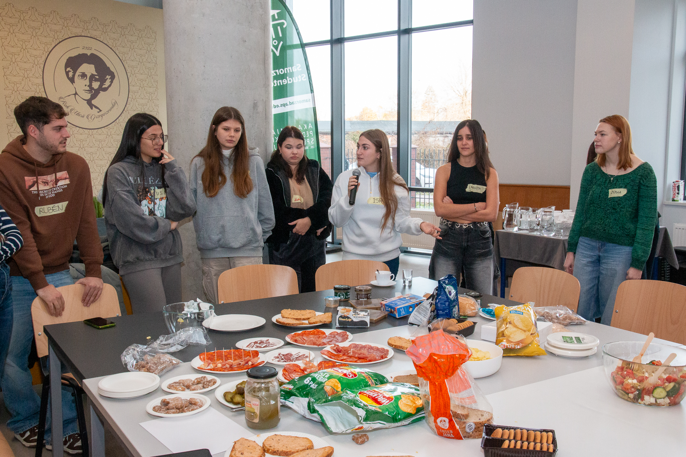 Następnie, w trakcie poczęstunku, uczestnicy spróbowali tradycyjnych potraw z Europy, w tym m.in. polskich słodyczy, hiszpańskich mięs, sałatki greckiej i irlandzkiej kanapki z chipsami.