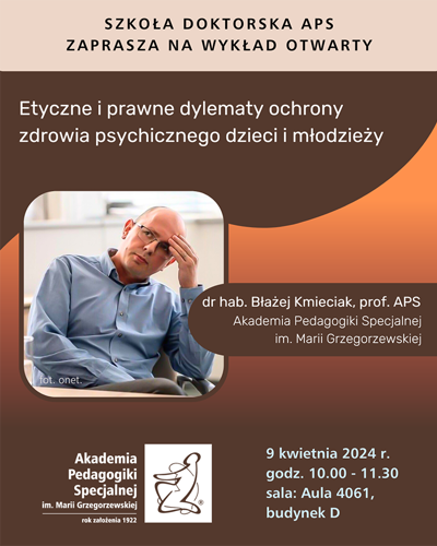 Zaproszenie przyjął dr hab. Błażej Kmieciak, prof. APS, który wygłosi wykład pt. "Etyczne i prawne dylematy ochrony zdrowia psychicznego dzieci i młodzieży".