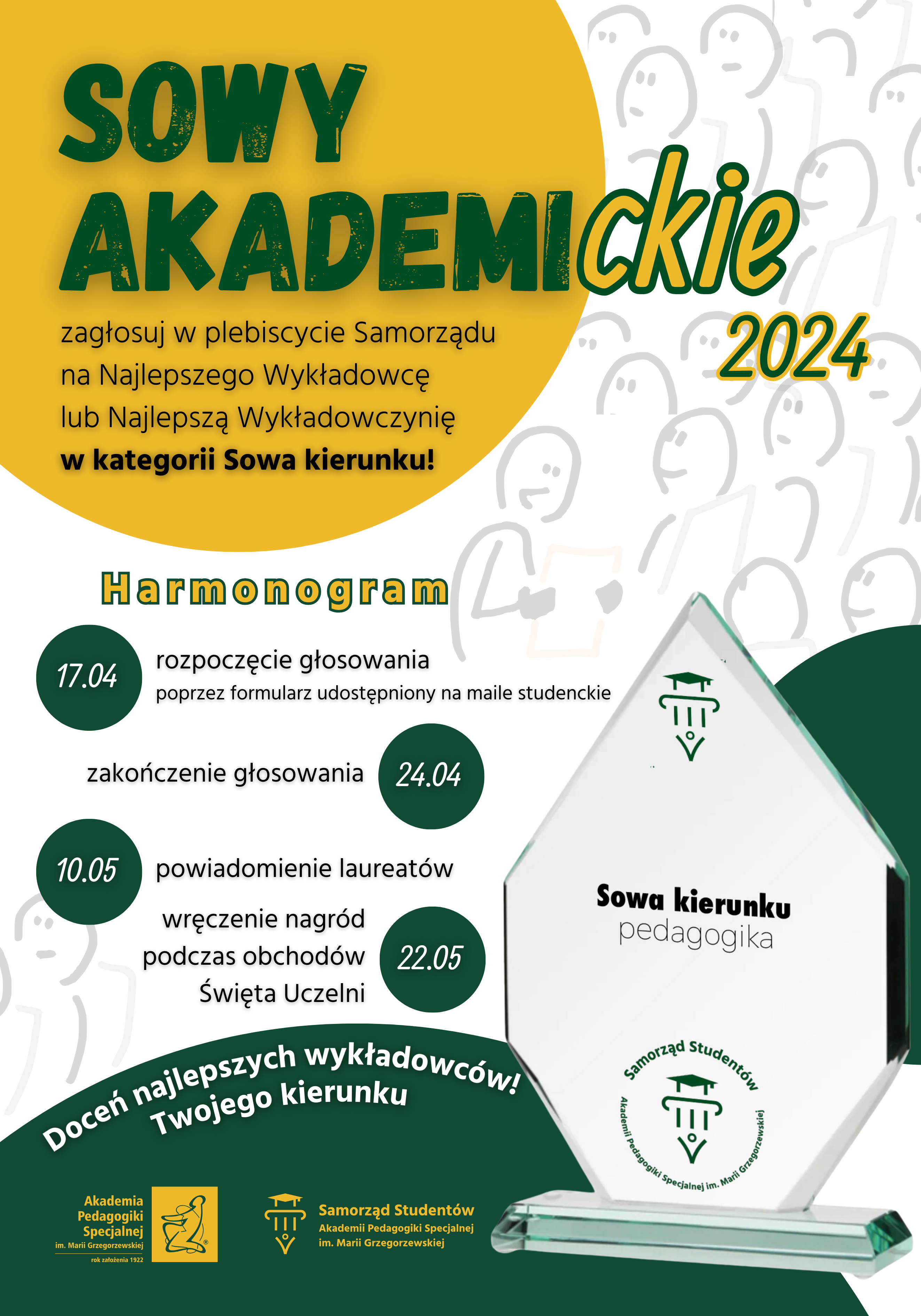 Sowy Kierunkowe to innowacyjna kategoria, która ma na celu wyłonienie i uhonorowanie najlepszych wykładowców na poszczególnych kierunkach studiów w naszej Uczelni. Dzięki akcji promocyjnej wspólnie stworzyliśmy sylwetkę najlepszego wykładowcy, najczęstsze cechy znajdziecie na naszym Facebooku  😉
